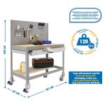 Banco de trabajo sin tornillos con bandejas de madera y cajón para almacenar herramientas. Incluye ruedas. Incluye panel perforado también para guardar herramientas y cuyo montaje sí que lleva tornillos. Es de color GRIS/MADERA.Tiene 2 estantes. Las dimensiones de esta Estantería son: 1560x1510x610 mm. Y tiene una capacidad de carga total de 120 kgs al llevar ruedas. Es fabricado en España y se monta rápido siguiendo las instrucciones.
