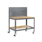 Banco de trabajo sin tornillos con bandejas de madera. Incluye ruedas. Incluye panel perforado para guardar herramientas y cuyo montaje sí que lleva tornillos. Es de color GRIS/MADERA.Tiene 2 estantes. Las dimensiones de esta Estantería son: 1560x1510x610 mm. Y tiene una capacidad de carga total de 120 kgs al llevar ruedas. Es fabricado en España y se monta rápido siguiendo las instrucciones.