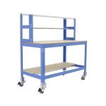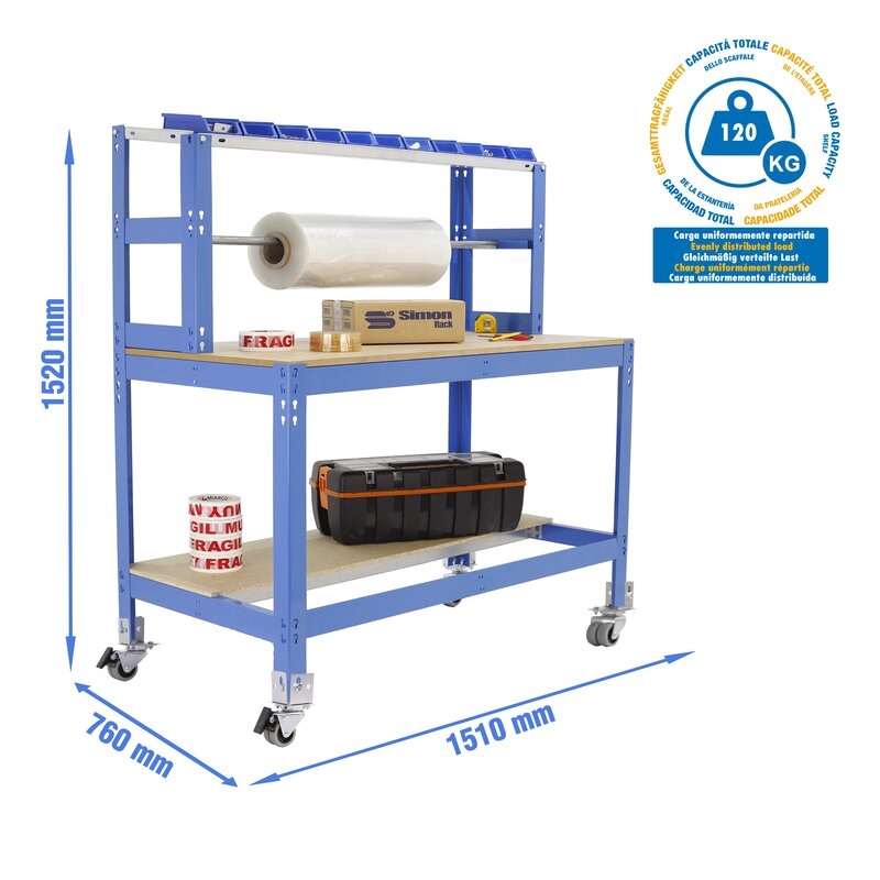 Banco de trabajo sin tornillos con bandejas de madera. Incluye ruedas. Incluye repisa superior (montaje con tornillos) y larguero cuelga rollos. Es de color AZUL/MADERA.Tiene 3 estantes. Las dimensiones de esta Estantería son: 1560x1510x760 mm. Y tiene una capacidad de carga total de 120 kgs al llevar ruedas. Es fabricado en España y se monta rápido siguiendo las instrucciones.