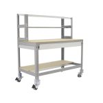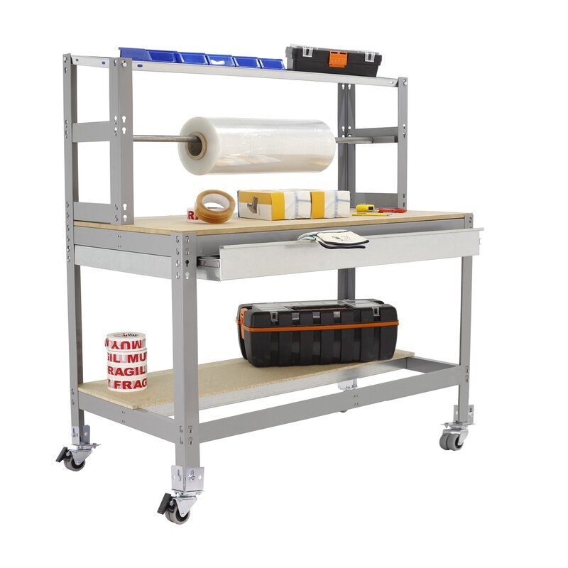 Banco de trabajo sin tornillos con bandejas de madera. Incluye ruedas. Incluye repisa superior (montaje con tornillos), cajón y larguero cuelga rollos. Es de color GRIS/MADERA.Tiene 3 estantes. Las dimensiones de esta Estantería son: 1560x1510x760 mm. Y tiene una capacidad de carga total de 120 kgs al llevar ruedas. Es fabricado en España y se monta rápido siguiendo las instrucciones.