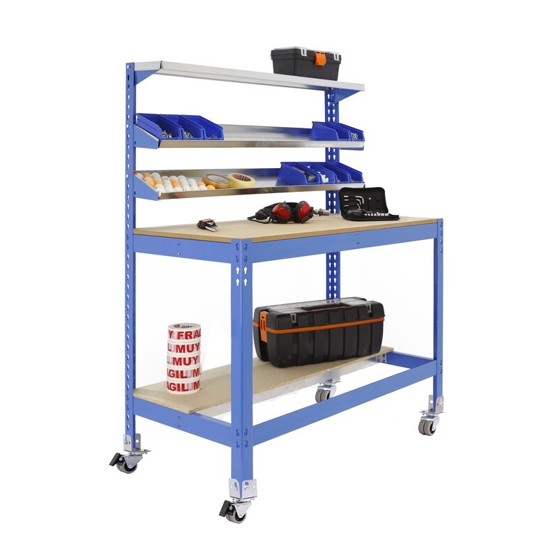 Banco de trabajo sin tornillos con bandejas de madera y 3 baldas reclinables. Incluye ruedas. Es de color AZUL/MADERA.Tiene 5 estantes. Las dimensiones de esta Estantería son: 1560x910x610 mm. Y tiene una capacidad de carga total de 120 kgs al llevar ruedas. Es fabricado en España y se monta rápido siguiendo las instrucciones.