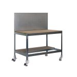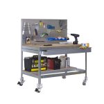 Banco de trabajo sin tornillos con bandejas de madera y cajón para almacenar herramientas. Incluye ruedas. Incluye panel perforado también para guardar herramientas y cuyo montaje sí que lleva tornillos. Es de color GALVA/MADERA.Tiene 2 estantes. Las dimensiones de esta Estantería son: 1560x910x610 mm. Y tiene una capacidad de carga total de 120 kgs al llevar ruedas. Es fabricado en España y se monta rápido siguiendo las instrucciones.