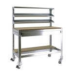 Banco de trabajo sin tornillos con bandejas de madera, 3 baldas reclinables y un cajón para guardar herramientas. Incluye ruedas. Es de color GALVA/MADERA.Tiene 5 estantes. Las dimensiones de esta Estantería son: 1560x910x610 mm. Y tiene una capacidad de carga total de 120 kgs al llevar ruedas. Es fabricado en España y se monta rápido siguiendo las instrucciones.