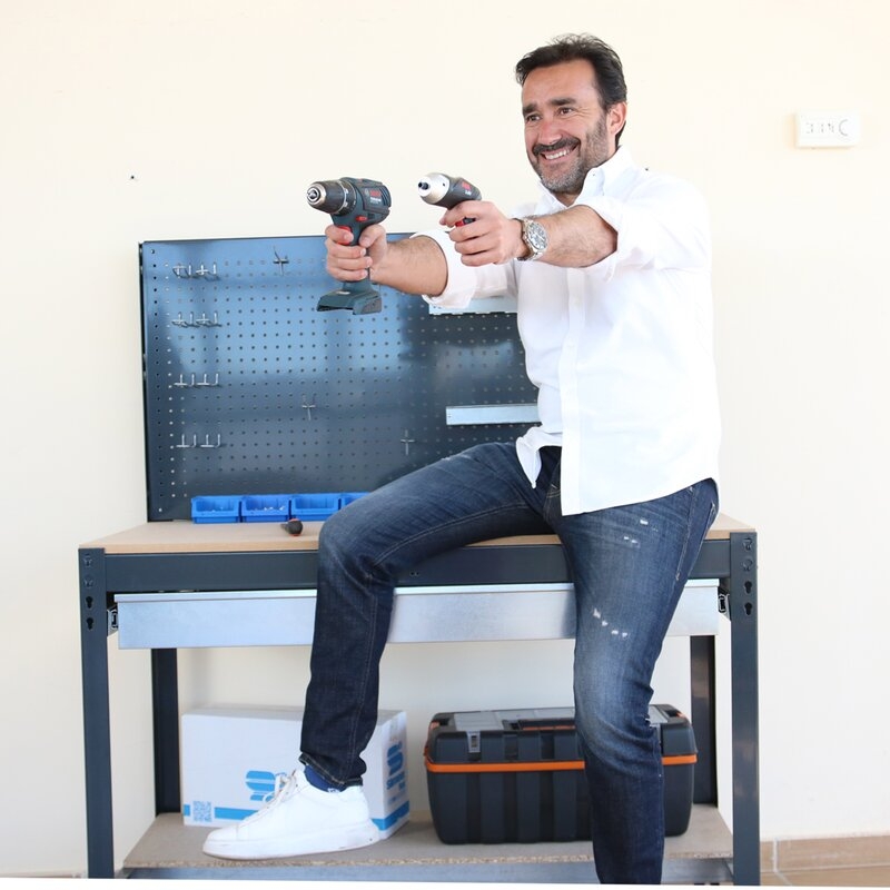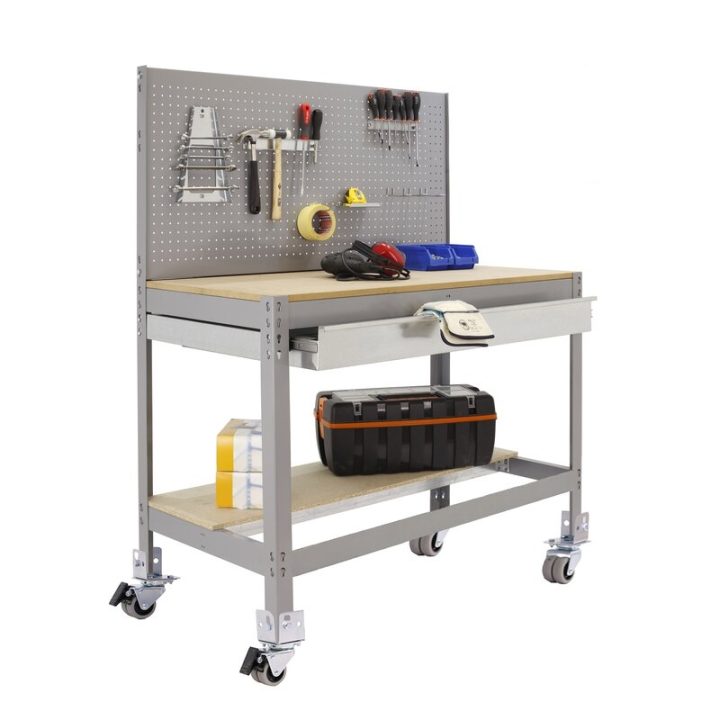 Banco de trabajo sin tornillos con bandejas de madera y cajón para almacenar herramientas. Incluye ruedas. Incluye panel perforado también para guardar herramientas y cuyo montaje sí que lleva tornillos. Es de color GRIS/MADERA.Tiene 2 estantes. Las dimensiones de esta Estantería son: 1560x910x610 mm. Y tiene una capacidad de carga total de 120 kgs al llevar ruedas. Es fabricado en España y se monta rápido siguiendo las instrucciones.