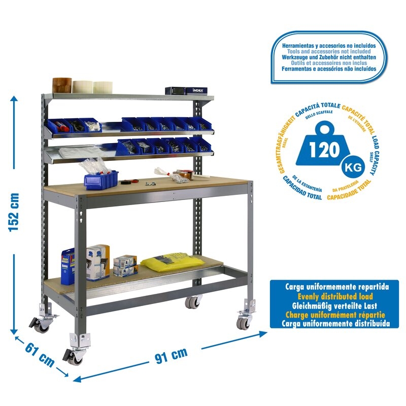Banco de trabajo sin tornillos con bandejas de madera y 3 baldas reclinables. Incluye ruedas. Es de color GRIS/MADERA.Tiene 5 estantes. Las dimensiones de esta Estantería son: 1560x910x610 mm. Y tiene una capacidad de carga total de 120 kgs al llevar ruedas. Es fabricado en España y se monta rápido siguiendo las instrucciones.