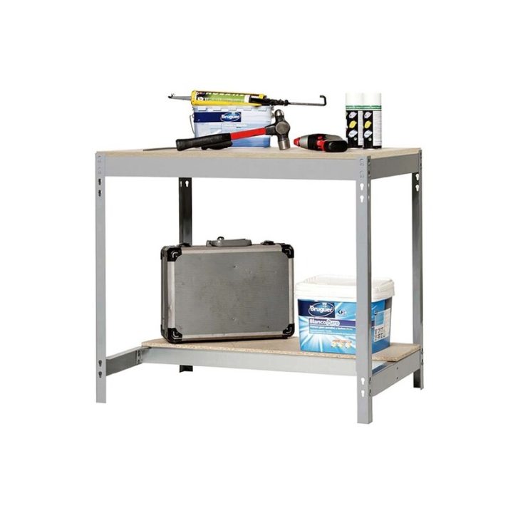 Banco de trabajo sin tornillos con bandejas de madera, de color GRIS/MADERA.Tiene 2 estantes. Las dimensiones de esta Estantería son: 842x1510x760 mm. Y tiene una capacidad de carga de 600 kgs el estante principal y 250 kgs el estante inferior. Es fabricado en España y se monta rápido siguiendo las instrucciones.