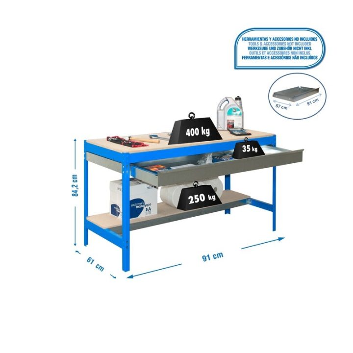 Banco de trabajo sin tornillos con bandejas de madera y cajón para guardar herramientas. Es de color AZUL/MADERA.Tiene 2 estantes. Las dimensiones de esta Estantería son: 842x910x610 mm. Y tiene una capacidad de carga de 400 kgs el estante principal y 250 kgs el estante inferior. El cajón aguanta hasta 35 kgs. Es fabricado en España y se monta rápido siguiendo las instrucciones.