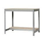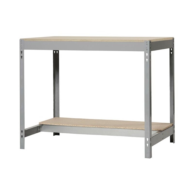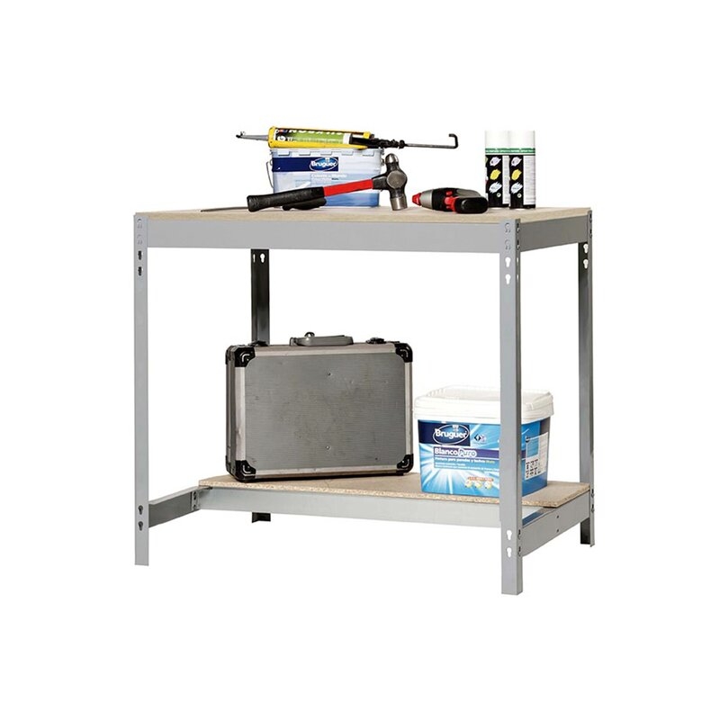Banco de trabajo sin tornillos con bandejas de madera, de color GRIS/MADERA.Tiene 2 estantes. Las dimensiones de esta estantería son: 842x1210x610 mm.