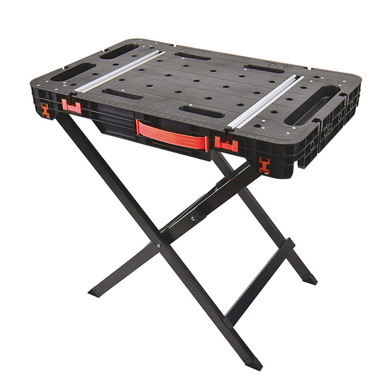 Entre sus características destacadas, incluye una función de regla integrada y un conector que permite la combinación de varias mesas, ofreciendo una mayor superficie de trabajo según las necesidades. Con una capacidad de carga máxima de 350 kg, este banco de trabajo es robusto y adecuado para diversas aplicaciones.