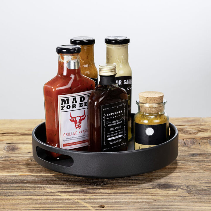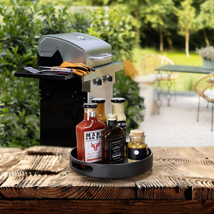 La bandeja giratoria es ideal para interiores y exteriores de armarios está fabricada en metal y polipropileno, garantizando durabilidad. De color negro y con un diámetro de 26 cm, esta bandeja es perfecta para mantener tus artículos al alcance y bien organizados.