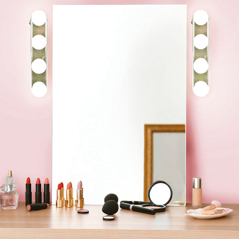 Esta barra luminosa es ideal para maquillarte gracias a la iluminación extra que aporta. Está compuesta mediante 4 bombillas Led de luz blanca. Se instala mediante ventosas, por lo que no deberás hacer ningún agujero. Funciona con 4 pilas AA que no están incluidas y tiene unas medidas de 30,5×6,5xh.6 cm. Viene presentada en una caja.