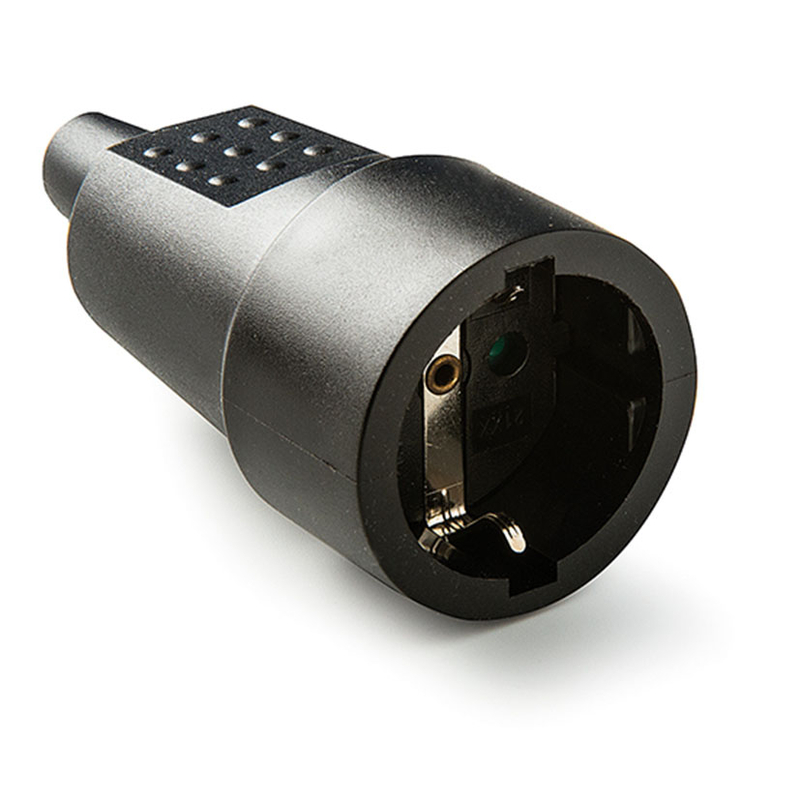 Este enchufe está fabricado en goma y de color negro. Trabaja a 16A/250V. Con toma a tierra lateral y un grado de protección IP20. Cumple con la normativa UNE 20315-1-1; UNE 20315-1-2 (IEC 60884-1). Puedes consultar la ficha técnica que tenemos en nuestra web. Se sirve en blíster.