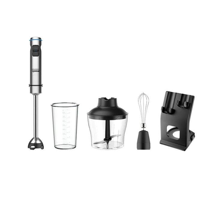 La batidora de mano GRUNKEL BM-1500SET ofrece un rendimiento excepcional gracias a su potente motor de 1500 W y función TURBO con indicador LED. Equipada con 4 cuchillas de acero inoxidable SUS 304, consigue un triturado eficiente y homogéneo. Incluye una varilla batidora y un brazo de acero inoxidable desmontable, un vaso medidor de 800 ml, picadora con cuchillas de acero, accesorio batidor para montar y emulsionar, y un práctico soporte organizador.