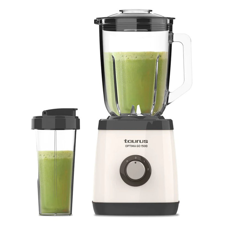 La batidora TAURUS cuenta con una potencia máxima de 1600W, resistentes cuchillas de 4 filos y 2 velocidades más turbo. Podrás preparar zumos, batidos, salsas y platos muy ricos en todo momento, hasta pica hielo. La jarra de vidrio transparente está graduada y tiene una capacidad de 1,50 l, en la parte superior de la tapa incorpora una boca de llenado de 50 ml para poder introducir los ingredientes durante el uso. Además, incluye una jarra o vaso para llevar tus batidos allá donde vayas. La base es antideslizante para un uso más cómodo. Además, dispone de un sistema de seguridad que solo funciona cuando la jarra está bien bloqueada. Se desmonta fácilmente para poder limpiarla. Los accesorios son aptos para el lavavajillas. Tiene 3 años de garantía. Viene presentado en caja.