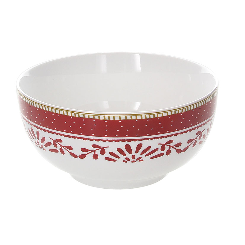 Bol fabricado en porcelana decorada con cenefa roja y dorada con ramas rojas en fondo blanco. Tienen un diámetro de 14 cm . Vienen presentados en caja de 6 unidades. Puedes combinarlo con el resto de productos que tenemos de esta misma serie.