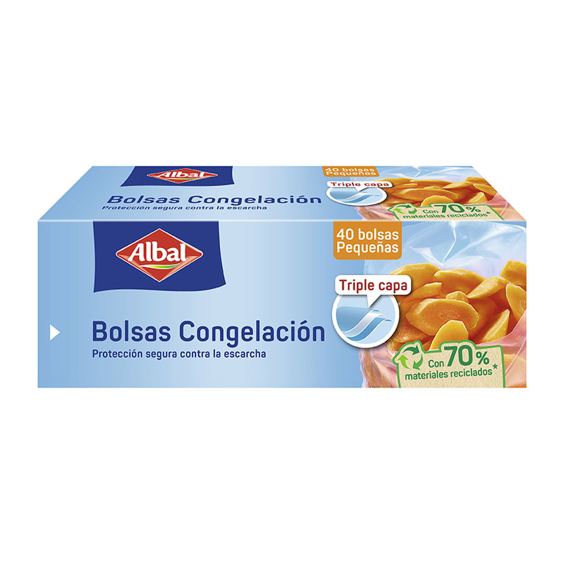 Rollo de 40 unidades de bolsas para congelar y están indicadas especialmente para uso alimentarío. Se presenta en una caja.