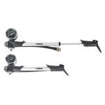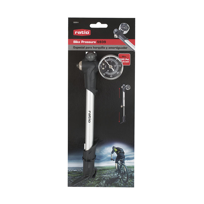 Esta bomba está confeccionada en poliamida y cuenta con cilindro de aluminio. Su manómetro de alta presión es idóneo para un ajuste personalizado de las suspensiones, en función del peso del ciclista y sus preferencias. Destaca su botón/pulsador para lograr un ajuste preciso de la presión de aire de 2-3 PSI para cada pulsación. Su presión máxima se sitúa en 20,68 Bar/ 300 PSI. Se presenta en una placa.