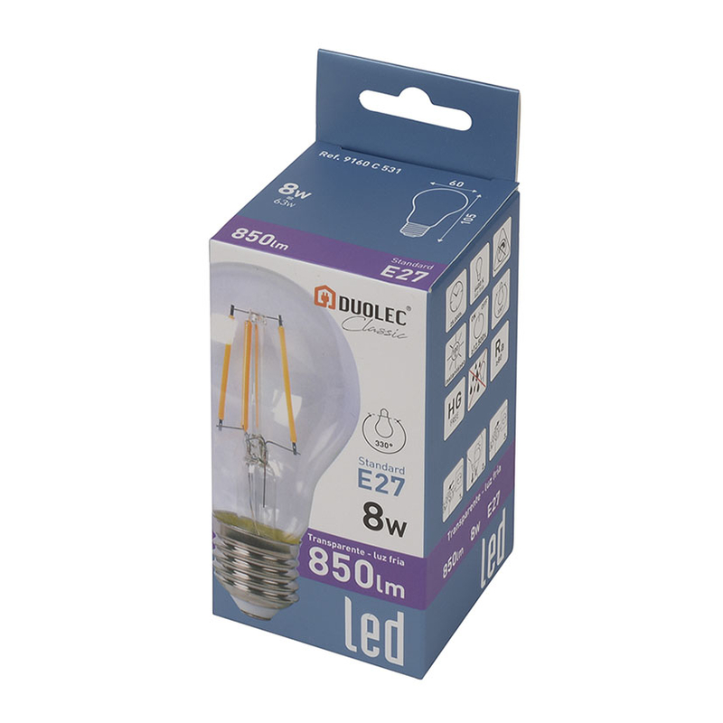 Bombilla Led con rosca E27 y de luz fría. Sus 8W de potencia emiten una intensidad lumínica de 850 Lumen a una temperatura de 6400º K. Tiene unas medidas de 60×105 mm. Misma forma que las lámparas incandescentes tradicionales. Otras características: gran potencia lumínica encendido instantáneo. Se presenta en caja.