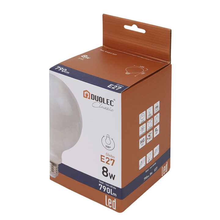 Bombilla Led con rosca E27 y de luz cálida. Sus 6W de potencia emiten una intensidad lumínica de 600 Lumen a una temperatura de 2700º K. Tiene unas medidas de Ø125×165 mm. Misma forma que las lámparas incandescentes tradicionales. Otras características: gran potencia lumínica encendido instantáneo. Se presenta en caja.