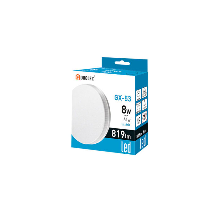 Bombilla tipo plafón con conexión GX-53 de fácil instalación. Ofrece un bajo consumo gracias a su tecnología Led. Sus 8 W de potencia de luz cálida 6500K emiten una potencia lumínica de 750 Lumen. Tiene una vida útil de hasta 25.000 horas. Tiene unas dimensiones de 74x22mm y viene presentada en una caja.