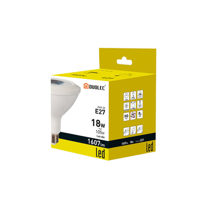 Bombilla de LED con casquillo tipo Par E27 y de luz cálida. Sus 18W de potencia emiten una intensidad lumínica de 1850 Lumen a una temperatura 4000ºK. Tiene unas medidas de ø120xh.135mm. Otras características: mayor potencia lumínica. Encendido instantáneo y 30.000 horas de vida útil. Se presenta en una caja.