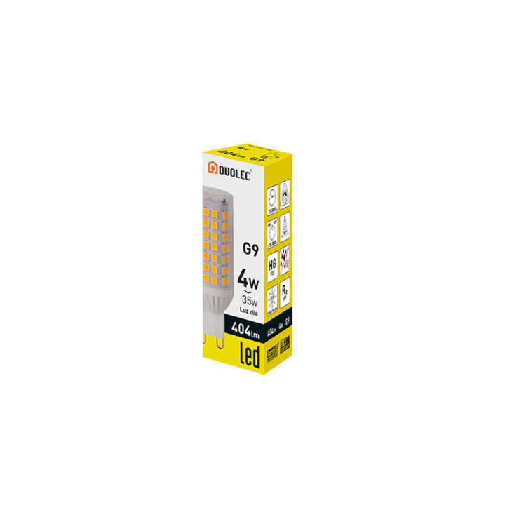 Bombilla Led DUOLEC de casquillo G9 y de luz neutra. Sus 3 3W de potencia emiten una intensidad lumínica de 380 Lumen de luz a una temperatura de 6500ºK. Con unas medidas de 17X53 mm. Otras características: mayor potencia lumínica. Encendido instantáneo y 25.000 horas de vida útil. Se presenta en Caja.