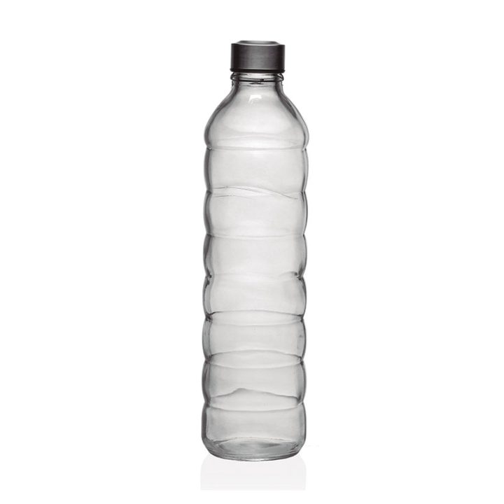 Esta botella está elaborada en vidrio transparente, incluye un tapón de rosca en color inox. Viene en una caja de 6 unidades en colores surtidos.