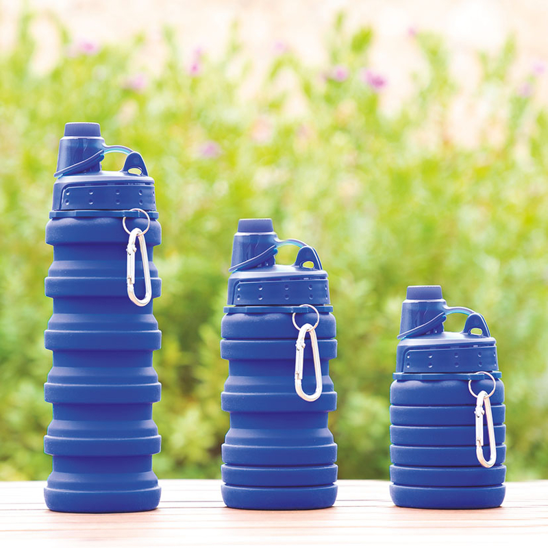 Esta botella está fabricada en polipropileno y silicona libre de BPA. De gran versatilidad que se ajusta a tus necesidades, lo que permite el ahorro y aprovechamiento óptimo del espacio. Tiene una boca ancha de vertido con tapa de rosca para facilitar el llenado y la limpieza. Dispone de un sistema de antigoteo, gancho metálico para colgar y boquilla para beber con tapón y doble protección antifugas. Su capacidad es de 500 ml y es apta para llenarla tanto de bebidas calientes como frías. Una vez hayas terminado su contenido la plegas ahorrando el 50% del espacio. Tiene unas medidas aproximadas de ø7×13-23 cm. Puedes ampliar la información con el video de nuestro proveedor que tenemos colgado en la web.
