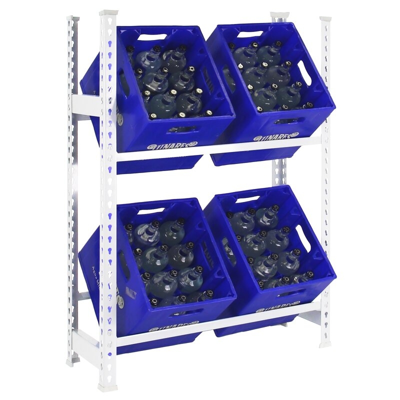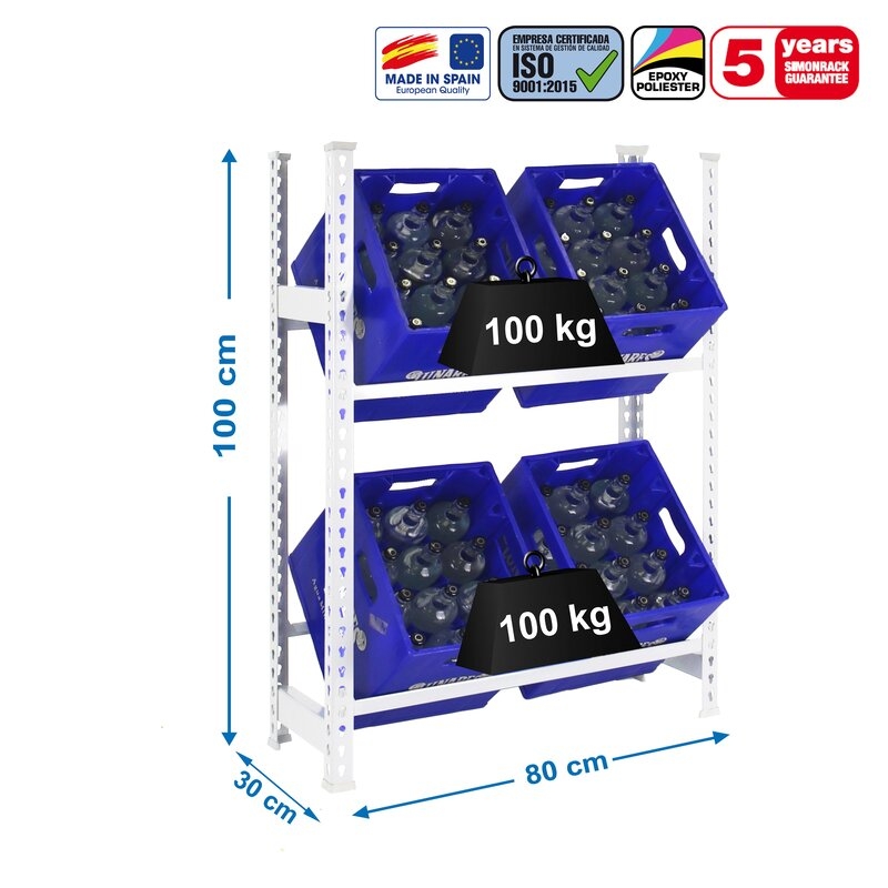 Botellero metálico, de color BLANCO .Tiene 2 estantes. Las dimensiones de esta estantería son: 1000x800x300 mm. Y tiene una capacidad de carga de 100 kgs por estante.