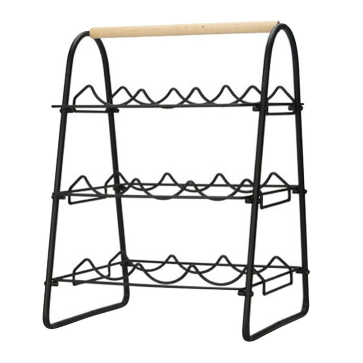 Con estructura metálica en color negro y asa superior en madera para que lo puedas desplazar fácilmente. Te permitirá almacenar 9 botellas. Tiene unas dimensiones de 33x29xh.46 cm