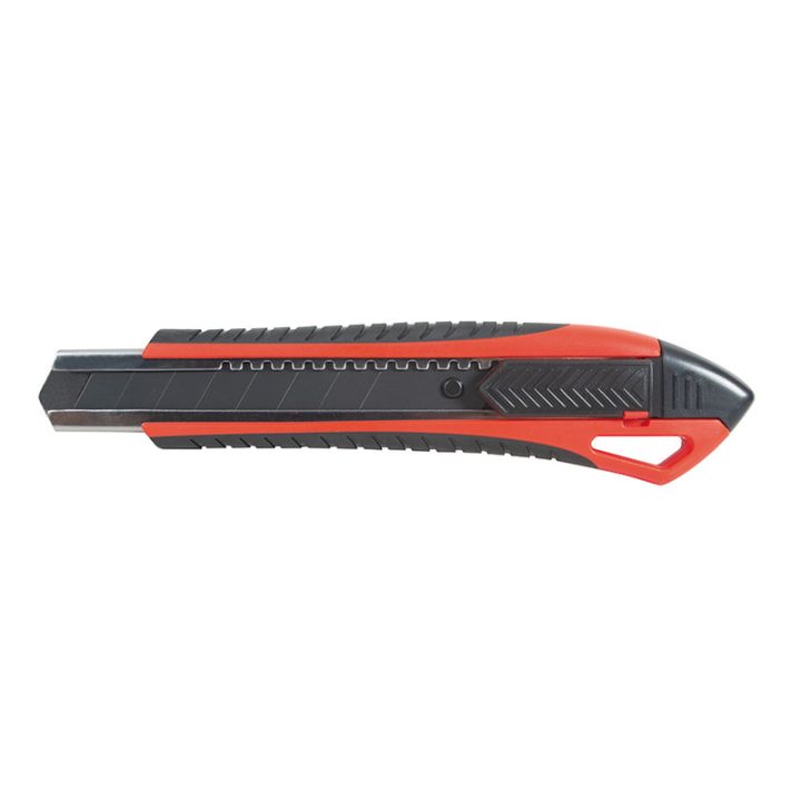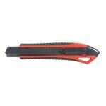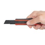 Cutter con sistema de bloqueo automático (Lock System) para mayor seguridad. Su mango antideslizante bimaterial (nilón/goma) garantiza un agarre cómodo y seguro. Incorpora guías interiores de acero inoxidable para un movimiento suave y una mayor durabilidad. La cuchilla de 18 mm tipo SK-2 tiene un tratamiento especial para un mejor afilado y un rendimiento superior. Dimensiones 168x30x20 mm