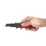 Cúter con mango antideslizante bimaterial (nilón/goma) para un agarre seguro. Equipado con guías interiores de acero inoxidable y cuchilla de 9 mm tipo SK-2 con tratamiento especial para un mejor afilado. Incluye punta endurecida para abrir cajas, botes de pintura y apretar tornillos, sin necesidad de usar la cuchilla. Dimensiones: 184x44x20 mm. Bloqueo automático para mayor seguridad.
