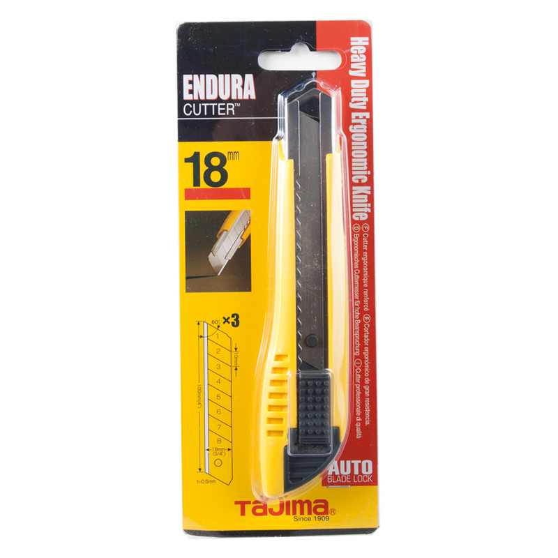 Cortador manual con bloqueo automático, indicado para trabajos donde se necesita ejercer presión para cortar materiales resistentes al corte. El mango es de acero inoxidable con protección ABS muy práctico para evitar cortaduras accidentales. El ancho cuchilla es de18 mm. Incluye 2 cuchillas de recambio. Viene presentado en un blíster.