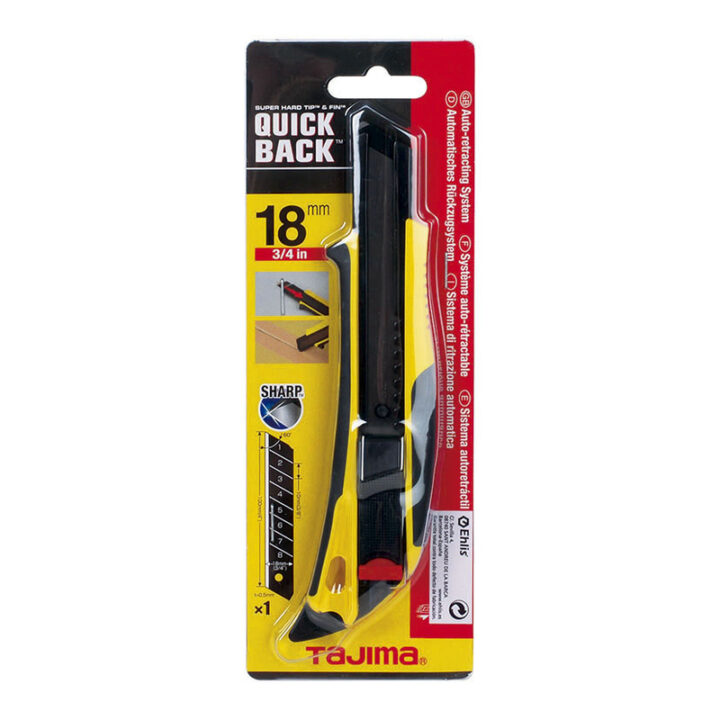 Cortador manual con bloqueo automático ajustable y regulable. El mango está fabricado en acero inoxidable que incorpora una protección ABS y recubrimiento antideslizante. Dispone de una punta endurecida Super Hard Tip para apretar tornillos de cabeza plana ideal para abrir botes de pintura, etc. Además, tiene un gancho trasero FIN pensado para abrir y realizar hendidos en cajas de cartón. El ancho de cuchilla es de 18 mm. Viene presentado en un blíster
