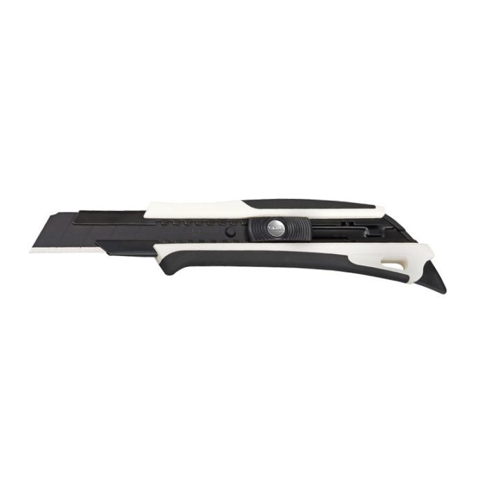 Cortador manual de cuerpo robusto con bloqueo automático, indicado para trabajos donde se necesita ejercer presión para cortar materiales resistentes al corte. El mango es de acero inoxidable con protección ABS y un recubrimiento antideslizante muy práctico para un mejor agarre. Con gancho trasero FIN para abrir y hacer palanca. El ancho cuchilla es de 25 mm. Gracias a su diseño podrás cortar cualquier tipo de material con la seguridad y la exactitud necesarias.
