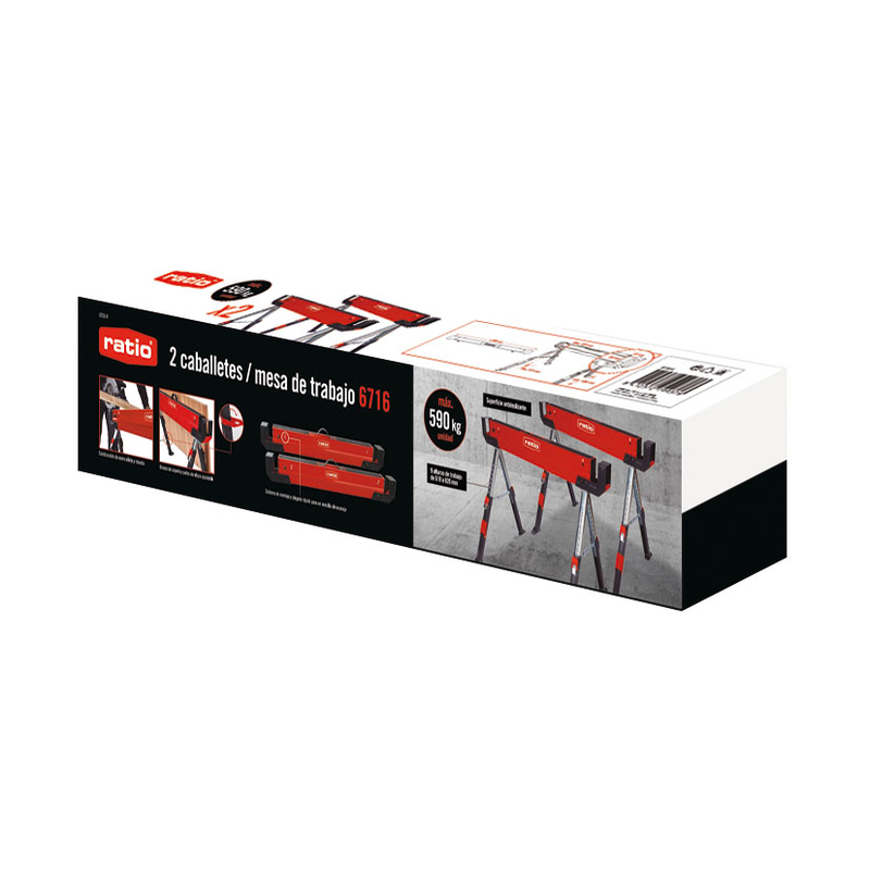Las patas ajustables permiten variar la altura de trabajo entre 61,8 cm y 82 cm, adaptándose a diversas necesidades. Además, los pies plegables facilitan el almacenamiento compacto, y el asa de transporte integrada permite un desplazamiento sencillo. Con una capacidad de carga de 590 kg por pieza, estos caballetes pueden soportar materiales pesados sin problemas. Las dimensiones incluyen una anchura de trabajo de 108,5 cm y una base de soporte de patas de 46,5 x 63,2 cm.