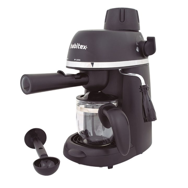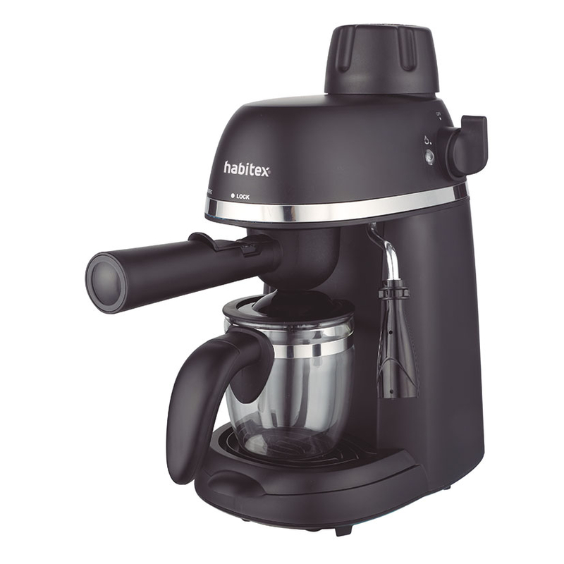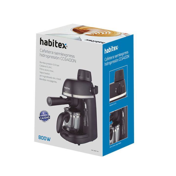La cafetera HABITEX semi-expresso tiene una potencia de 800W y trabaja a una presión de 3,5 bar y tiene una capacidad para 2/4 tazas de café. Inluye filtro de acero inoxidable, vaporizador para poder calentar la leche y hacer infusiones, jarra graduada de cristal, cuchara dosificadora y bandeja recogegotas extraíble. Gracias al indicador luminoso podrás ver en todo momento el funcionamiento de la cafetera. Además dispone de protección de contra sobrecalentamiento y sobrepresión. Viene presentada en una caja y tiene 3 años de garantía.