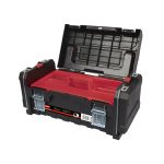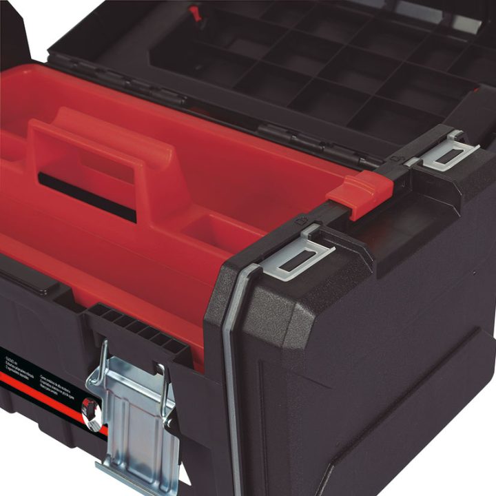 La caja de herramientas RATIO 7800 está diseñada para ofrecer una organización eficiente y un transporte cómodo, fabricada en polipropileno de alta resistencia con características que garantizan durabilidad y facilidad de uso. Dispone de asas de alumnio con tecnología ConfortGrip, que proporcionan un agarre ergonómico y cómodo durante el transporte. Tiene doble cierre metálico con un hueco para candado, permitiendo una mayor seguridad en el almacenamiento de las herramientas.