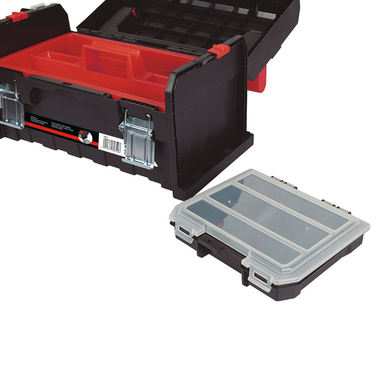 Incluye 1 bandeja interior ideal para herramientas pequeñas o de uso frecuente. Cuenta con 2 organizadores extraíbles en los laterales, proporcionando espacio adicional para almacenar piezas pequeñas como tornillos y tuercas.