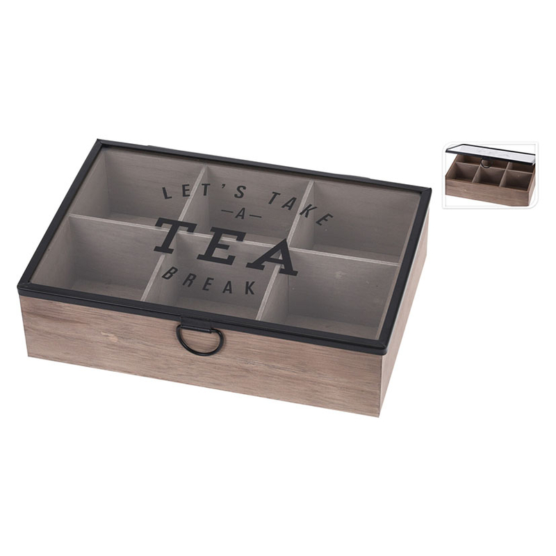 Esta caja está fabricada en MDF, tiene 6 compartimentos para que puedas organizar tus infusiones o tés fácilmente. La tapa es de cristal con letras grabadas en el mismo color que el ribeteado de la tapa, por lo que le da un toque distintivo y original. Tiene unas dimensiones de 24×16,5xh.7 cm.