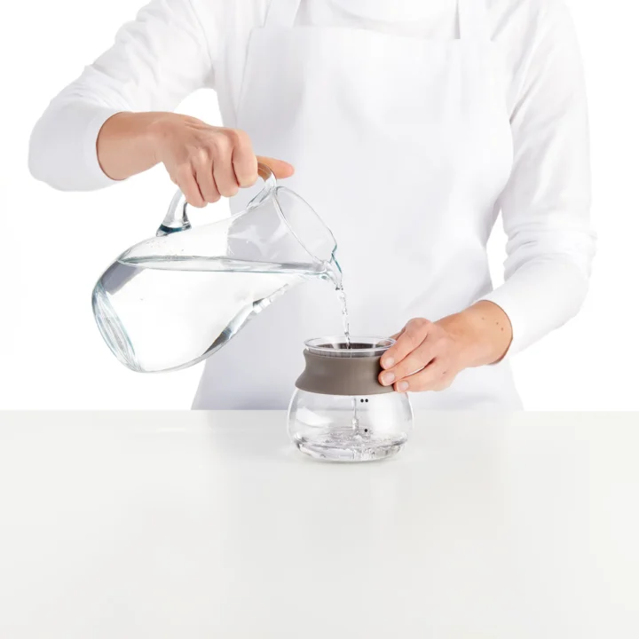 El infusor está compuesto por dos jarras de cristal transparentes, aptas para microondas, para que se pueda observar el contenido. En su interior hay unos puntos que indican la cantidad de agua a rellenar dependiendo si se desean una o dos raciones.