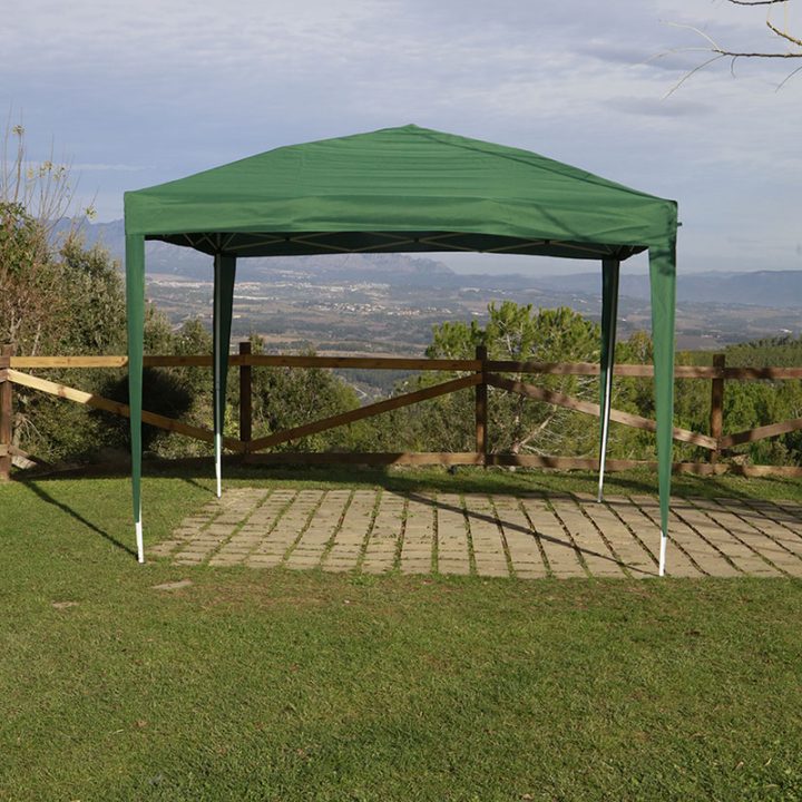 Está carpa e plegable y tiene un sistema de montaje rápido, ideal para tenerla a punto en tiempo récord. Está equipada con una lona en color verde y faldón recto, ideal para protegerte del sol y poder disfrutar de tu espacio siempre que quieras. Además, es de fácil limpieza, solo tendrás que limpiarla aplicando un trapo húmedo. Las dimensiones de esta carpa son 3×3 m y una altura de 2,55 m. Viene presentada en una caja.