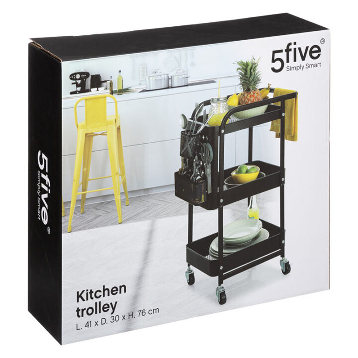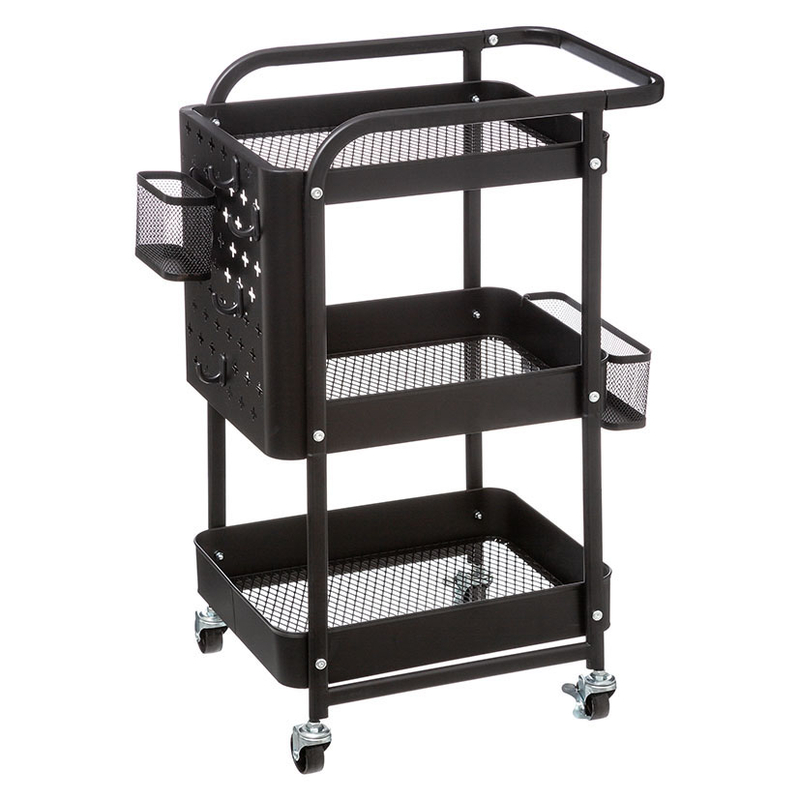 Este carro auxiliar está fabricado en metal pintado en color negro. Lo puedes mover fácilmente gracias a las ruedas que lleva incoporadas. Dispone de 3 pisos bandejas y ganchos que te aportarán un espacio adicional de almacenamiento y un asa en la que puedes colgar trapos o toallas. Es perfecto para transportar los platos, cubiertos y la vajilla hacia la mesa. Se presenta en una caja desmontado.
