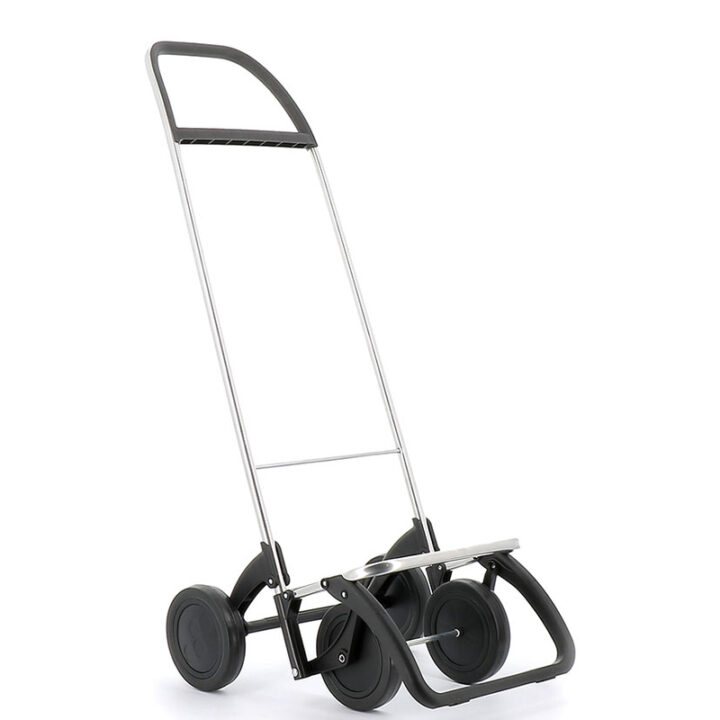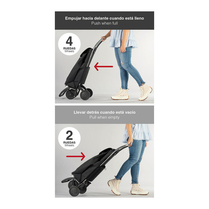 El carro ROLSER tiene un chasis en aluminio de 4 ruedas una base interior abatible y bolsa tipo saco con tejido LN (poliéster) de dimensiones 34x22x58 cm. Incorpora una asa ergonómica para un mejor agarre y transporte. Este modelo tiene una bolsa de 43 litros de capacidad. El carro tiene una carga máxima de 40 kilos y una carga recomendada de 25 kg para transportar con mayor facilidad la compra. Puedes llevarlo en dos posiciones: dos ruedas para llevar detrás cuando está vacio, y delante empujando cuando esté lleno. Lo puedes plegar ocupando el mínimo espacio.