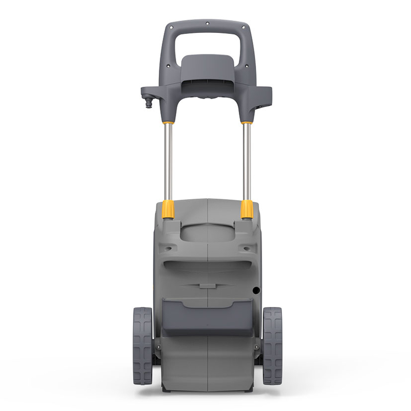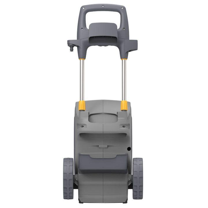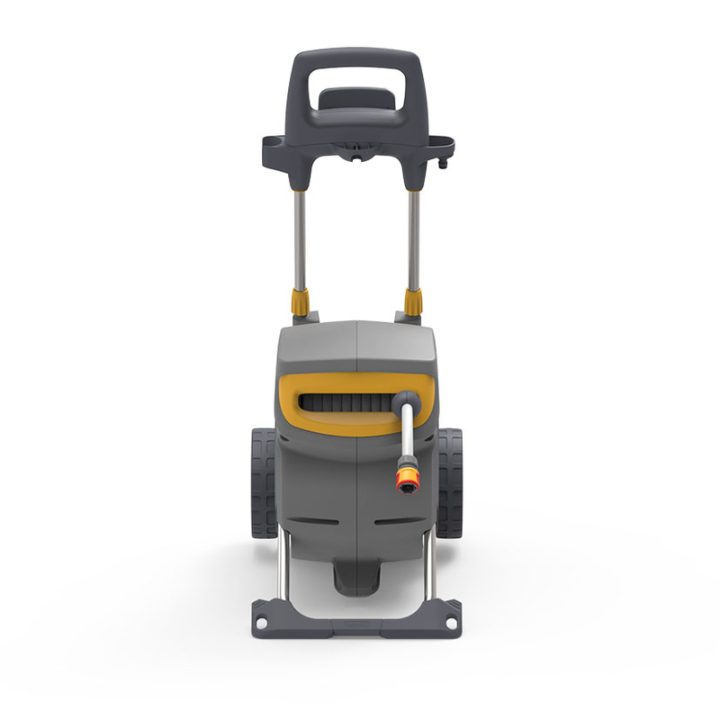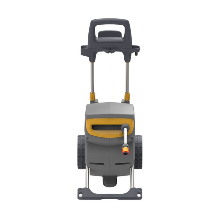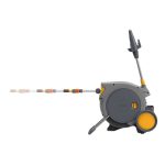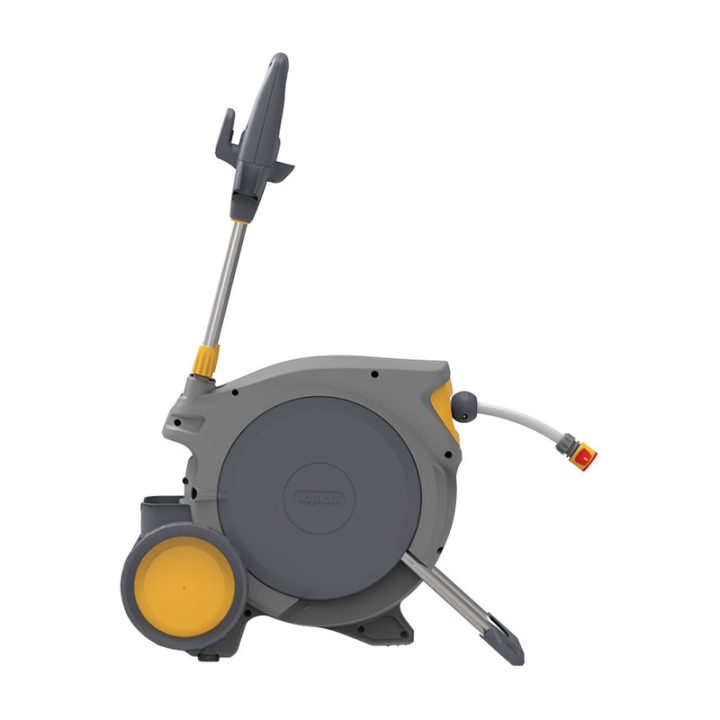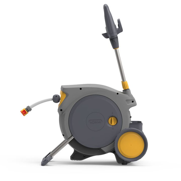 Este carro enrollador dispone de un mecanismo que se bloquea automáticamente a intervalos regulares para evitar una retracción accidental. Dispone de un mecanismo de frenado que garantiza un rebobinado suave y controlado, sin dobleces ni enredos. Dispone de manguera de alta calidad anti torsión, seguro para niños, lanza 3 en 1, un mango ajustable y guarda-manguera de alimentación. Además de un almacenamiento de accesorios.