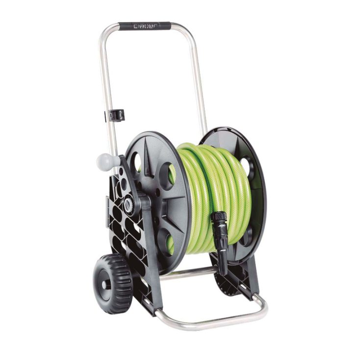 Este carro portamanguera es estable y fácil de mover. Es ideal para espacios estrechos y listo para su uso. El mango es telescópico fácil de cerrar gracias a las dos palancas laterales. Su estructura es de aluminio y las ruedas carenadas perfectas para una movilidad perfecta en cualquier terreno. Incluye 20 metros de manguera Aquaviva de ø 1/2″ (12,5 mm), 4 conectores automáticos (uno con aquastop), lanza rociadora, conexión de grifo y horquilla portagoma.