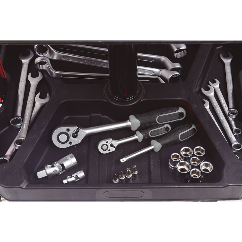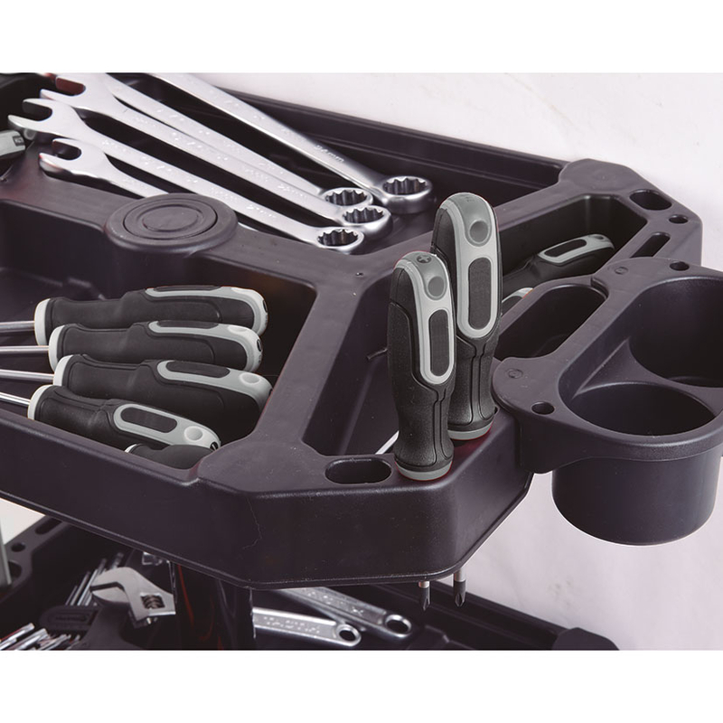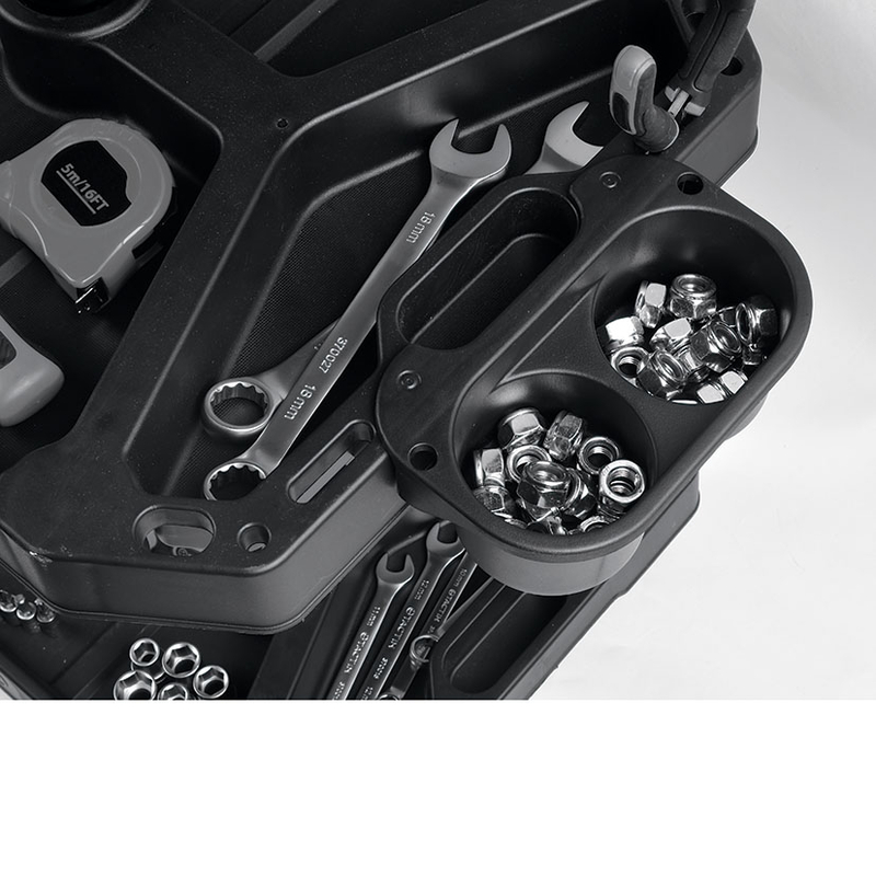 Compuesto por 3 bandejas modulares, cada una con accesorios y compartimientos multiuso, que permiten una organización eficiente de las herramientas y materiales.