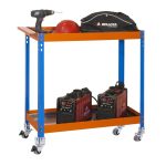 Carro metálico con ruedas y bandeja metálica, de color AZUL/NARANJA/GALVA.Tiene 2 estantes. Sus dimensiones son: 1030x900x400 mm. Y tiene una capacidad de carga de 75 kgs. Es fabricado en España y se monta rápido siguiendo las instrucciones.