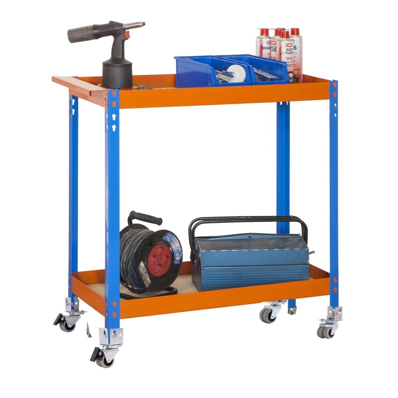 Carro metálico con ruedas y bandeja de madera, de color AZUL/NARANJA/MADERA.Tiene 2 estantes. Sus dimensiones son: 1030x900x400 mm. Y tiene una capacidad de carga de 75 kgs. Es fabricado en España y se monta rápido siguiendo las instrucciones.