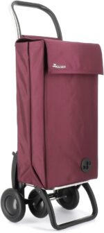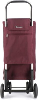 Carro Rolser de aluminio color burdeos, convertible 2/4 ruedas, ideal para transportar pequeñas cargas con facilidad. Incluye bolsa SBELTA MF de gran capacidad con bolsillos y armazón interior plegable.